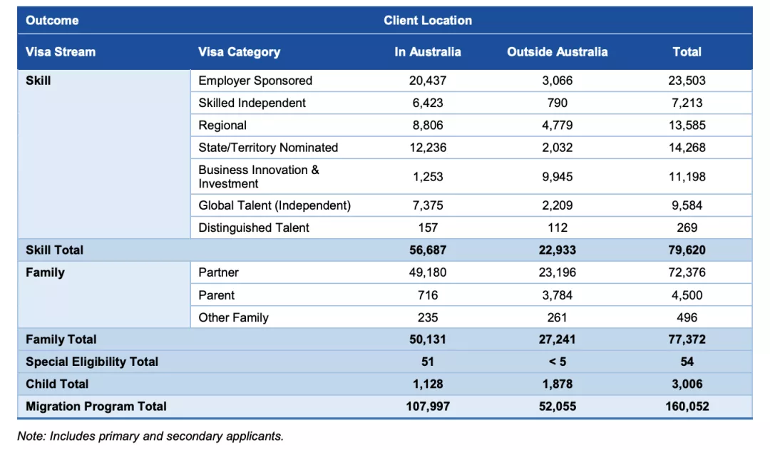 近日,澳洲移民局公布了2020-21財年的最新移民報告,截止2021年6月30日,該財年澳洲永久移民項目共發放了160,052個名額(原定配額為16萬個)。其中,技術移民共發放了79,620個名額;家庭簽證發放了77,372個名額,特別資格簽證發放了54個名額,兒童類簽證發放了3,006個名額。