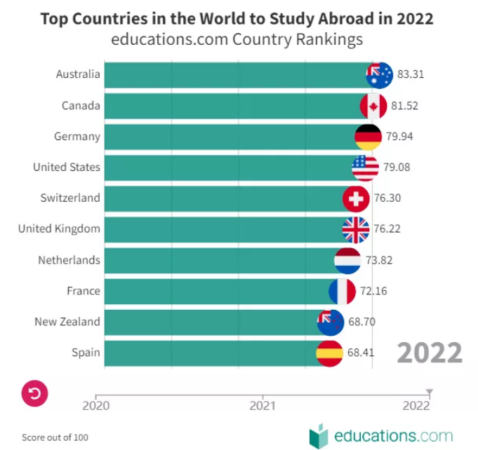近日,專注出國(guó)留學(xué)信息發(fā)布的全球教育網(wǎng)站educations.com發(fā)布了2022年全球十大最佳留學(xué)國(guó)家排行榜。澳大利亞雄踞榜首,加拿大位居第二,德國(guó)位居第三,一直被視作留學(xué)熱門國(guó)的美國(guó)和英國(guó)分別位居第四和第六。