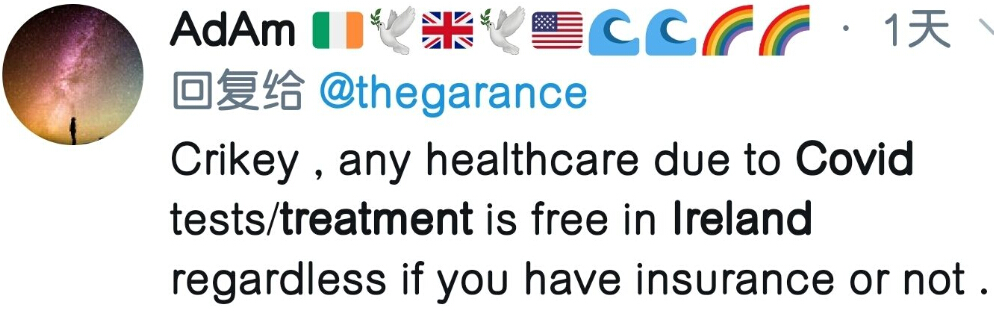 “在愛爾蘭,所有新冠病毒費用都免費哦,不管你有沒有保險。”