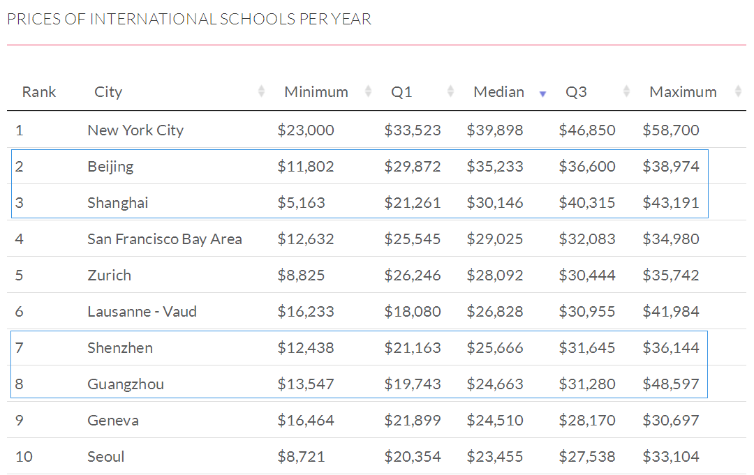 北京的國際學校中位數為35,233美元(約23萬人民幣);