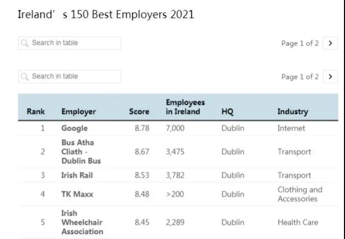首屆《星期日獨立報》Statista公布了愛爾蘭150家Best Employers(最佳雇主)名單,該排名是基于對擁有200名以上員工公司的一項綜合研究。