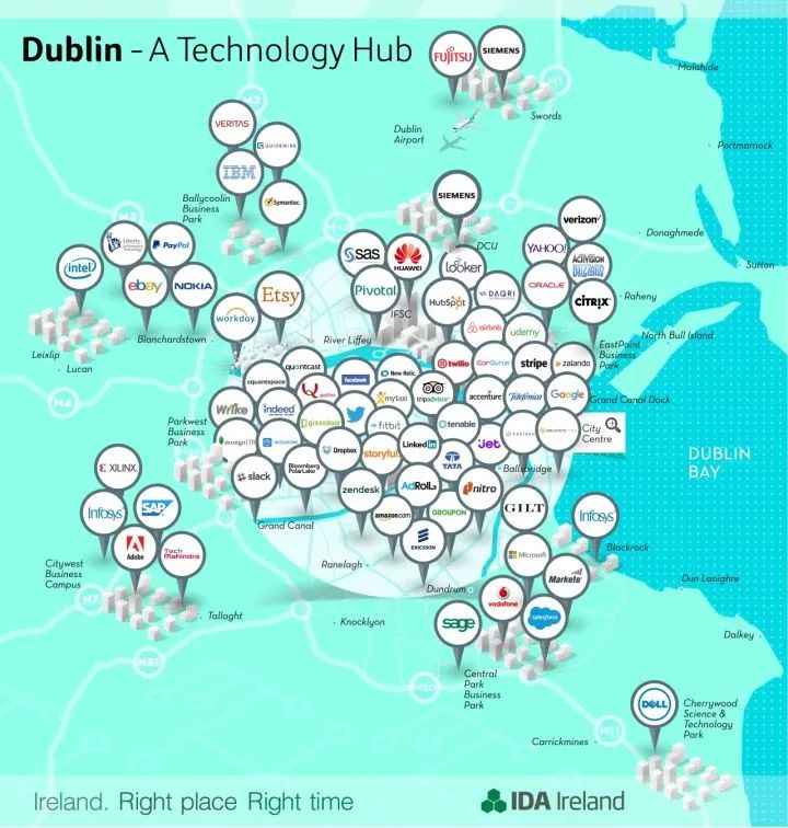 眾多歐美及中國互聯網科技公司都在愛爾蘭有非常大的運營規模,并以愛爾蘭作為中心輻射全球市場。比如蘋果、谷歌、Meta、微軟、亞馬遜、LinkedIn、Twitter、IBM、英特爾、華為和抖音等大型科技公司。