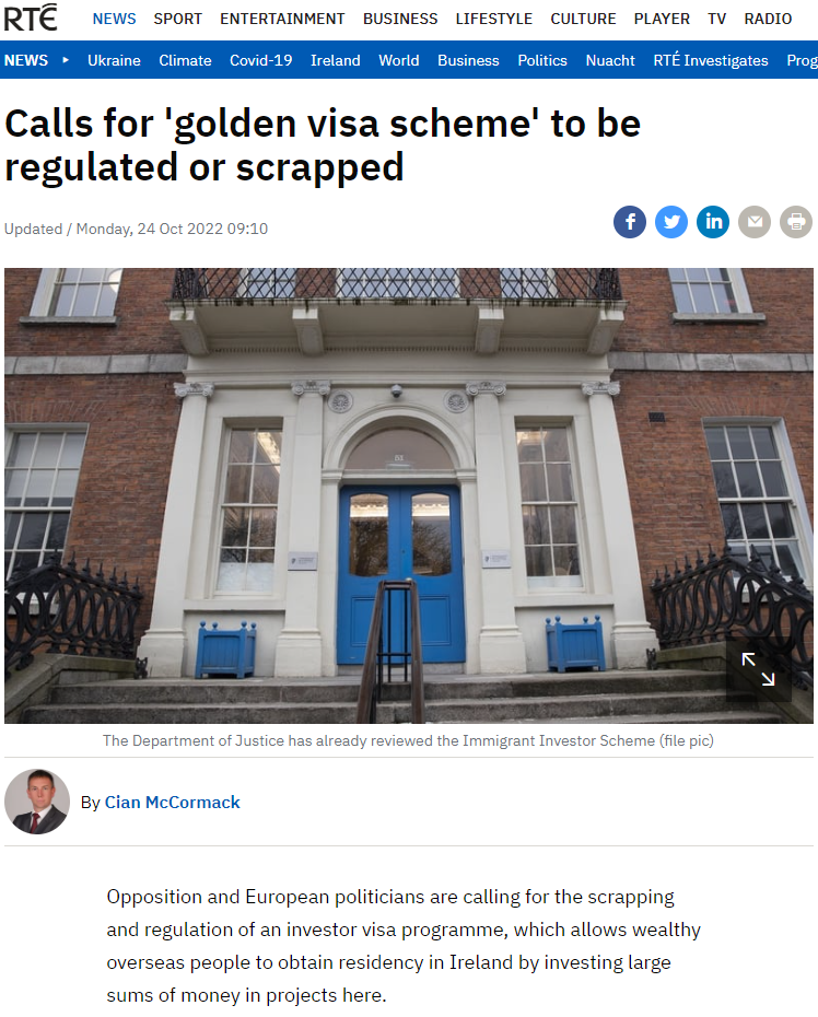 激增的移民申請數據迅速引起了業界關注。10月24日,據愛爾蘭國家廣播電臺RTÉ報道,愛爾蘭反對派和部分歐洲政界人士呼吁廢除或監管“愛爾蘭投資移民計劃”。