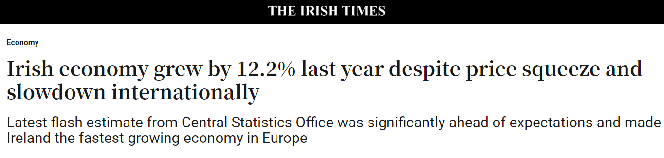 盡管全球經濟大幅放緩,但愛爾蘭經濟卻仍高速增長12.2%,大大超過政府預期,再次成為歐盟增長最快的經濟體,幾乎是排名第二的葡萄牙(6.5%)的兩倍,是歐盟平均水平(3.3%)的近四倍。