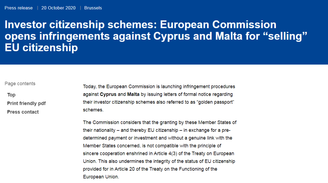 10月20日,歐盟委員會發布公告,宣布就“黃金護照”項目向塞浦路斯和馬耳他下發“正式通知函”,要求兩國政府在2個月內做出答復,據此正式啟動對塞浦路斯和馬耳他的訴訟程序。