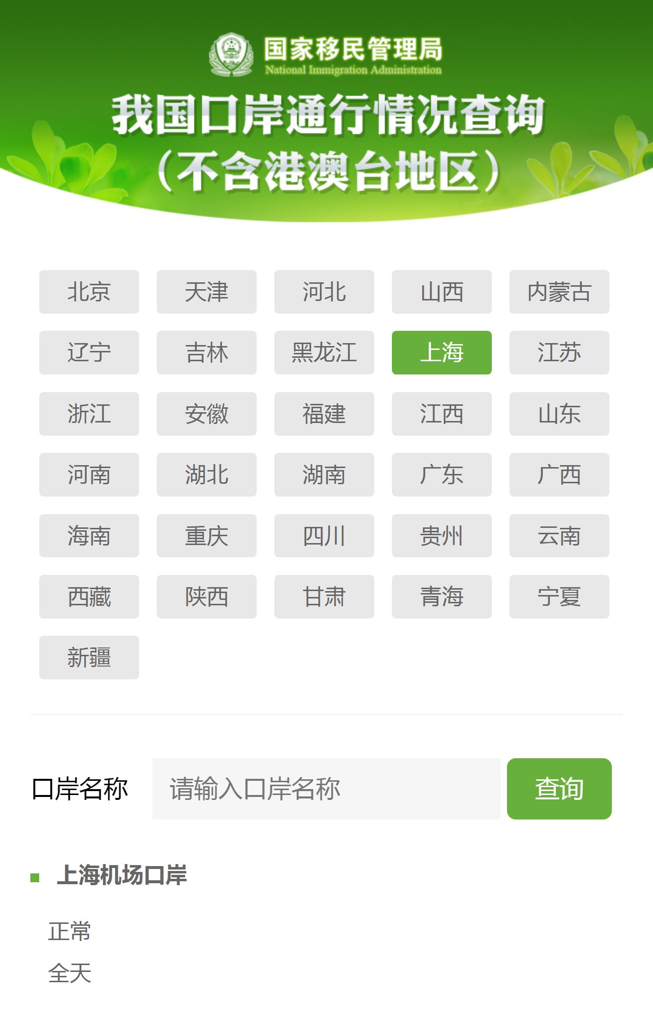點擊“我國口岸通行情況查詢”,輸入您準備出入境的口岸名稱,比如“上海機場”,通行情況、開放時間等信息一鍵掌握!