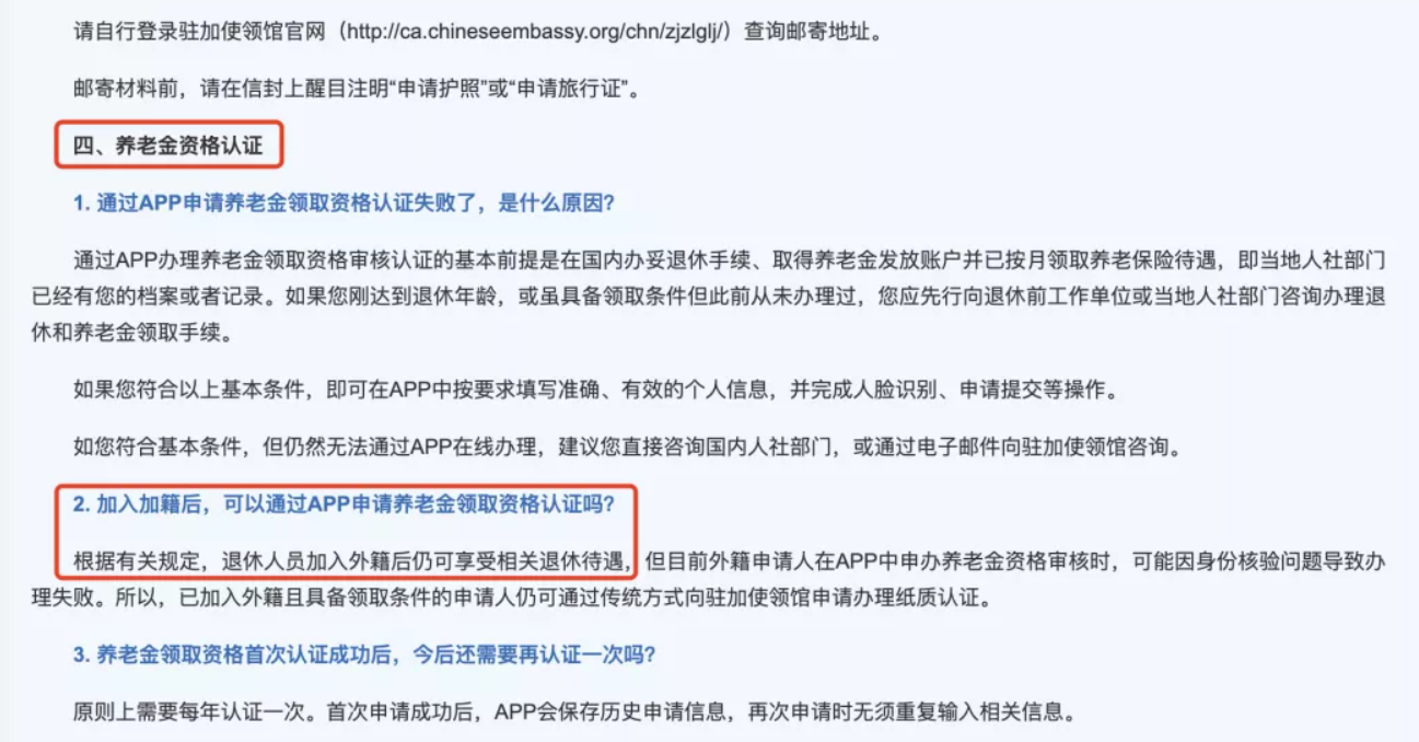 A根據有關規定,退休人員加入外籍后仍可享受相關退休待遇,但目前外籍申請人在APP中申辦養老金資格審核時,可能因身份核驗問題導致辦理失敗。所以,已加入外籍且具備領取條件的申請人仍可通過傳統方式向駐加使領館申請辦理紙質認證。