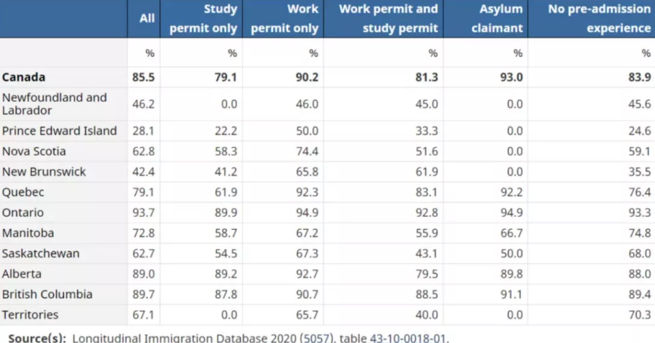 報告顯示,登陸5年后近86%的移民留在了他們原來的登陸省份或地區。在省級層面,安大略省的總體保留率最高,達93.7%;其次是卑詩省,保留率達89.7%;阿爾伯塔省為89%,排名第三。