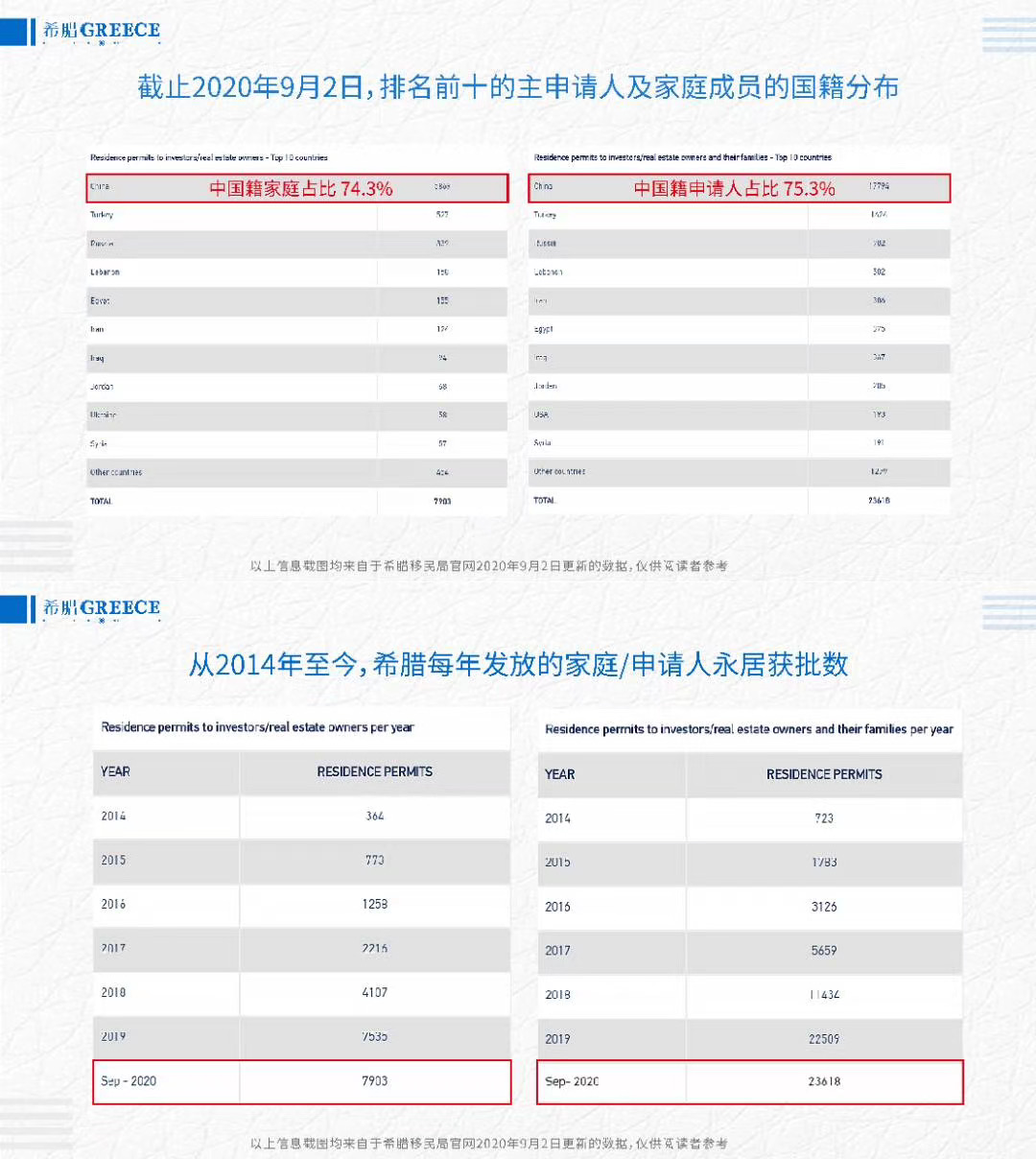 根據(jù)希臘移民局發(fā)布的最新黃金簽證數(shù)據(jù):截至2020年9月2日,希臘政府一共為主申請人簽發(fā)永久居留許可7903份,累計(jì)向31521位申請人(投資者及其附屬家庭成員)發(fā)放永居許可。