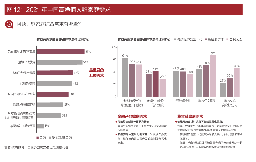 2021年,高凈值人群年輕化趨勢凸顯,40歲以下高凈值人群成為中堅力量,占比42%??v觀2021年高凈值人群家庭需求,多元化的資產配置、境內外子女教育、穩健的大類資產配置、代際傳承安排、全球化定制化的產品服務占據了前5名。
