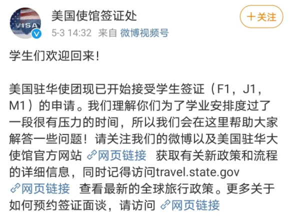 美恢復(fù)了對中國留學(xué)生的簽證工作