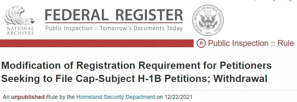 當地時間12月22日,美國移民局(USCIS)發布聲明:正式撤回特朗普政府于2021年1月8日所發布的“依據薪資水平對H-1B簽證申請人進行抽簽的規則”。