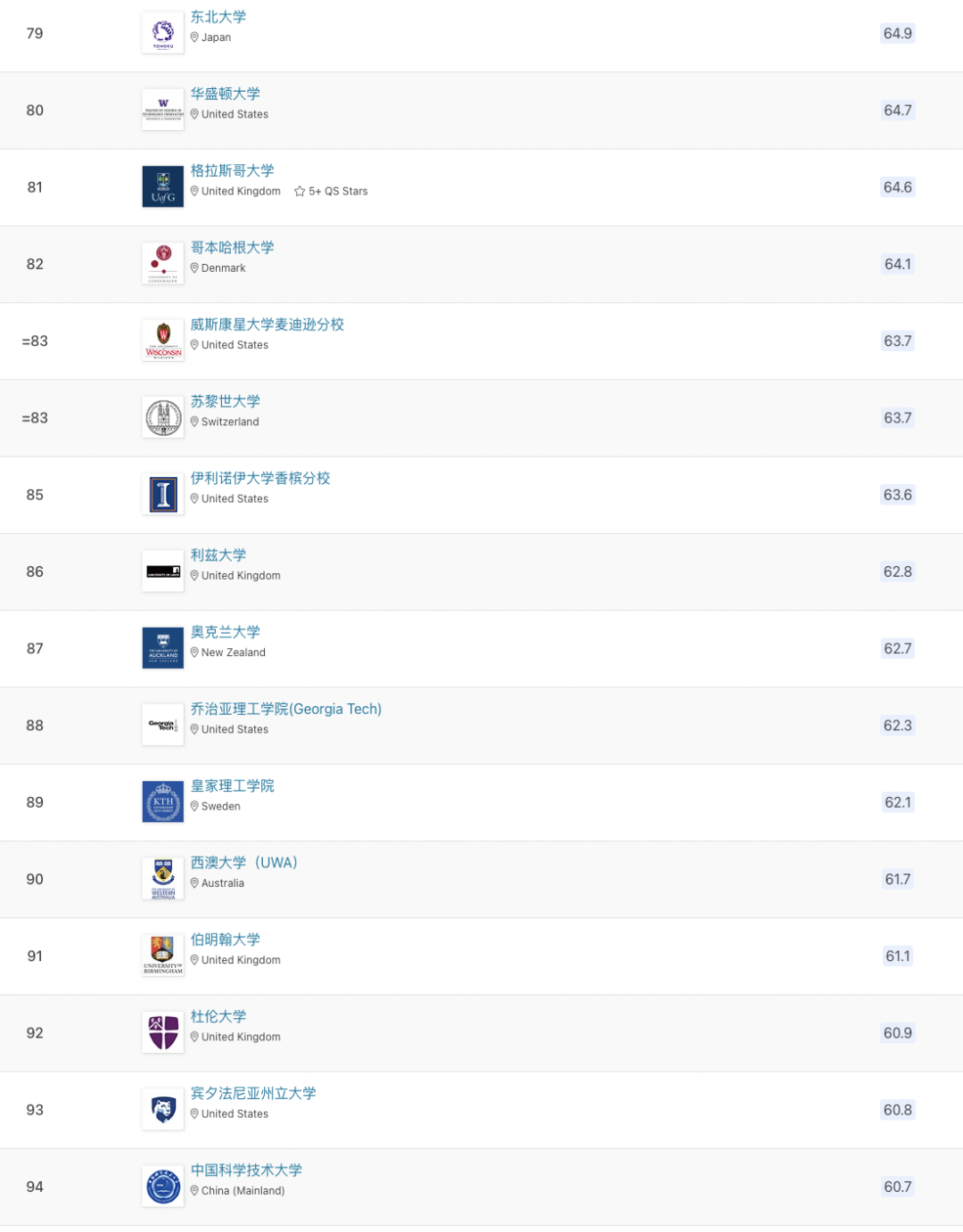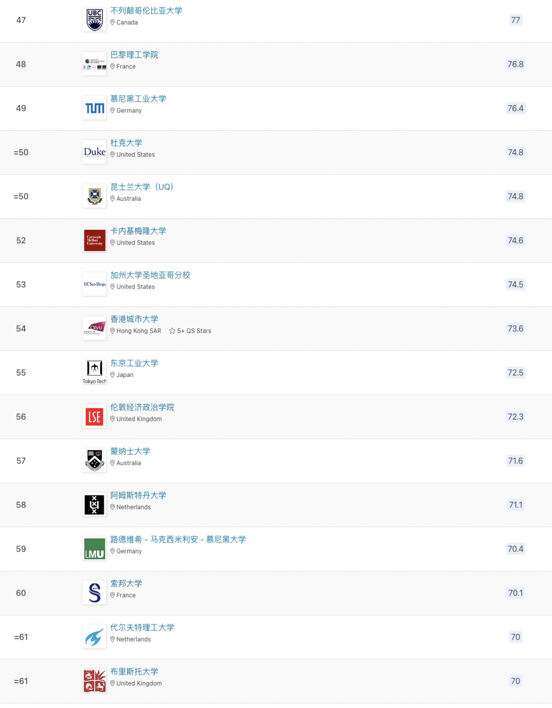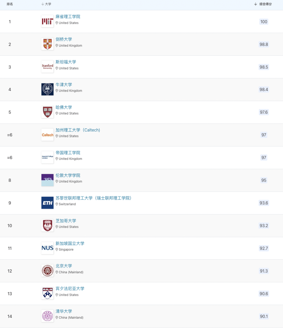 以下為世界前100所大學排名: