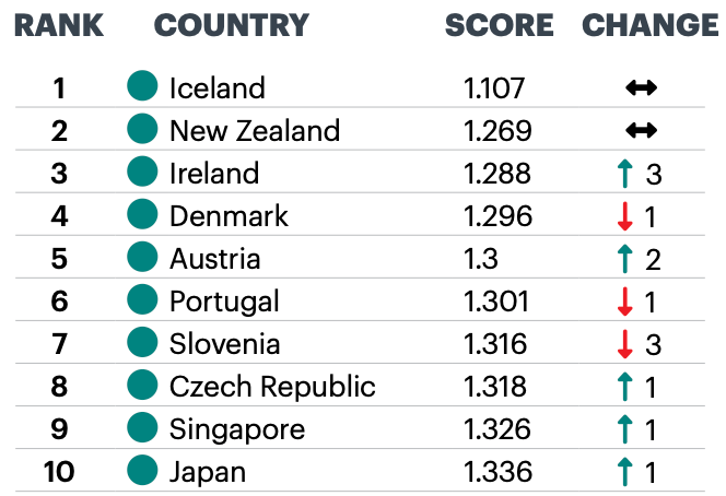 《2022全球和平指數》排名前十國家分別為:冰島、新西蘭、愛爾蘭、丹麥、奧地利、葡萄牙、斯洛文尼亞、捷克、新加坡和日本。