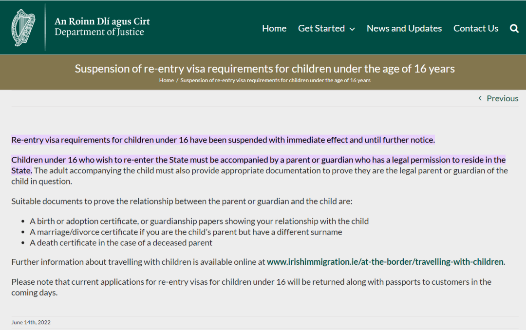 6月14日,愛爾蘭司法部門和移民局發布通知稱,取消對16歲以下兒童再次入境愛爾蘭的簽證要求,并表示該規定立即生效,直至進一步通知。