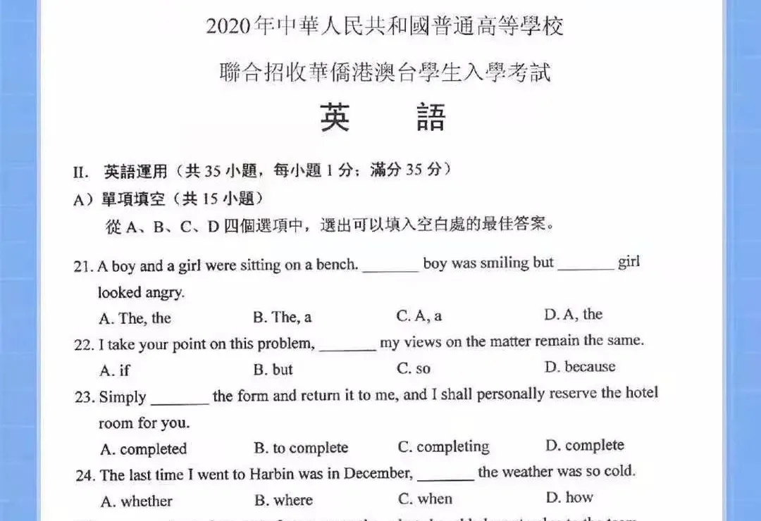 大家來感受下2020年華僑生聯(lián)考試卷: