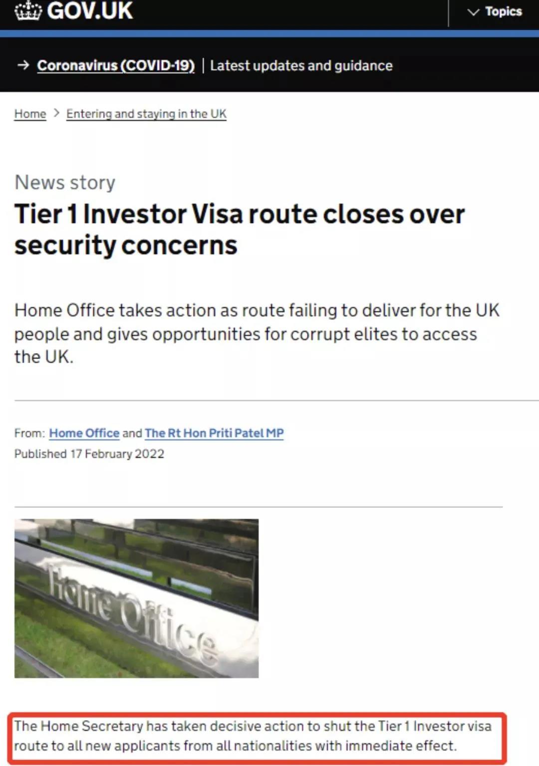 重磅!英國(guó)內(nèi)政部2月17日正式宣布,即刻關(guān)閉Tier 1投資移民(Investor)簽證。